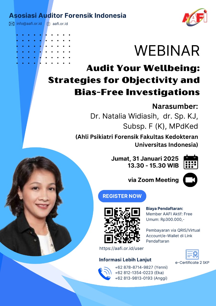 Ikuti webinar Audit Your Wellbeing: Strategies for Objectivity and Bias-Free Investigations bersama Dr. Natalia Widiasih, dr. Sp.KJ, Subsp. F(K), MPdKed. (Ahli Psikiatri Forensik Fakultas Kedokteran Universitas Indonesia)
