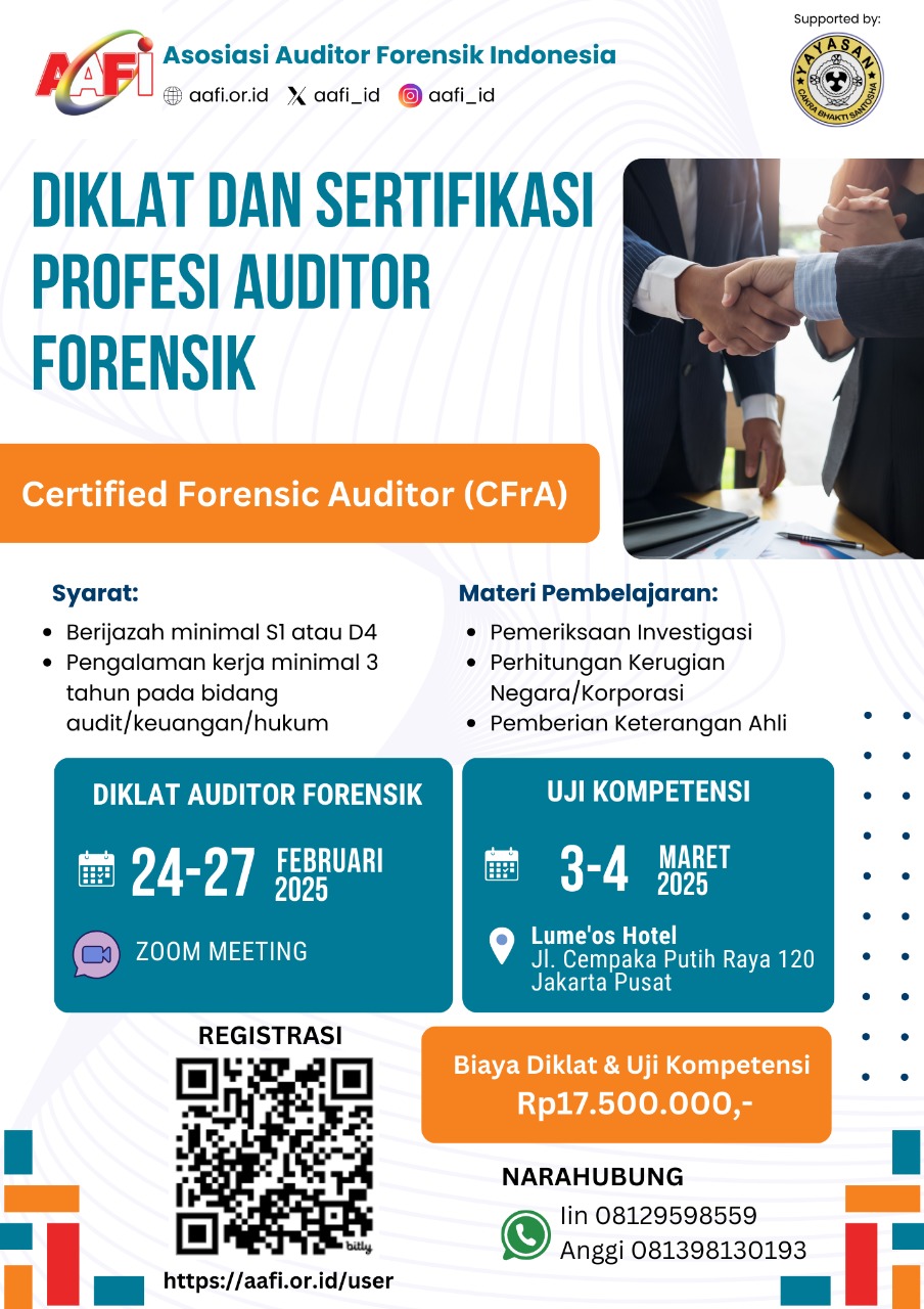 Asosiasi Auditor Forensik Indonesia Manggame (AAFI MANGGAME), dengan dukungan dari Yayasan Cakra Bhakti Santosha, kembali mengadakan Diklat dan Sertifikasi Profesi Auditor Forensik dengan gelar Certified Forensic Auditor (CFrA). Program ini bertujuan untuk meningkatkan kompetensi para auditor dalam bidang audit investigatif dan forensik guna mendukung upaya pemberantasan tindak pidana keuangan dan korupsi.