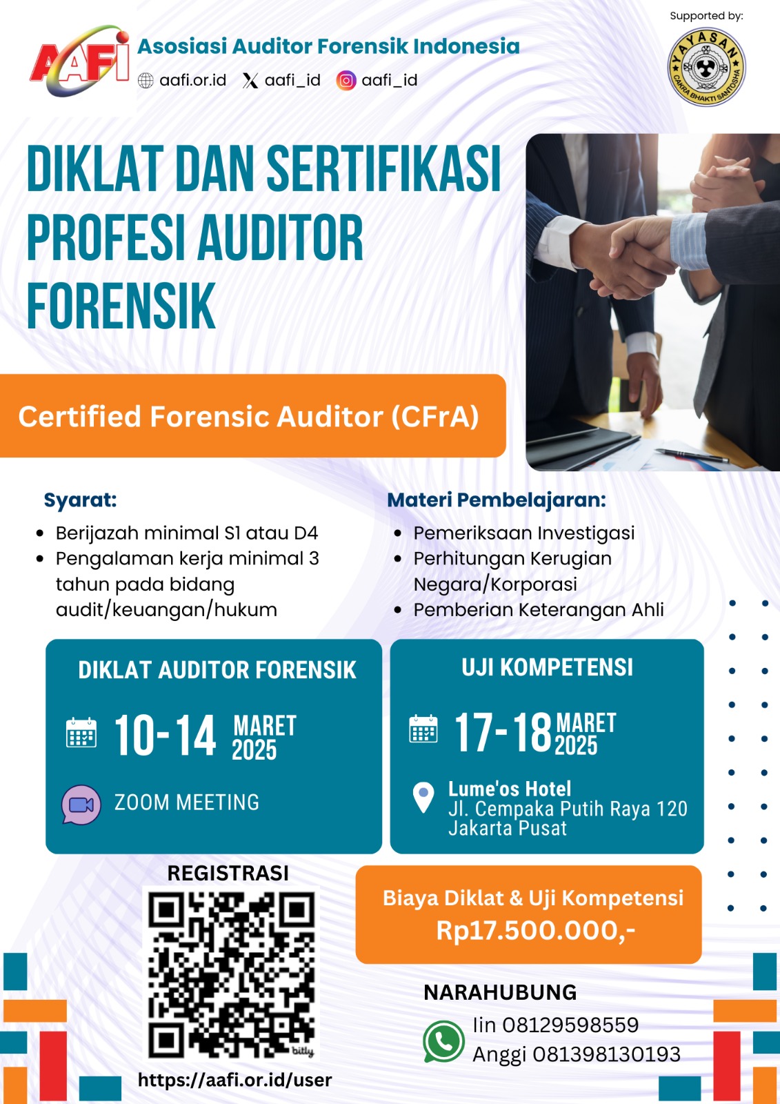 Asosiasi Auditor Forensik Indonesia Manggame (AAFI MANGGAME), dengan dukungan dari Yayasan Cakra Bhakti Santosha, kembali mengadakan Diklat dan Sertifikasi Profesi Auditor Forensik dengan gelar Certified Forensic Auditor (CFrA). Program ini bertujuan untuk meningkatkan kompetensi para auditor dalam bidang audit investigatif dan forensik guna mendukung upaya pemberantasan tindak pidana keuangan dan korupsi.